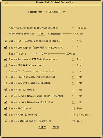 Стратегия защиты определена не только Базой Правил, но и параметрами в разделе Control Properties/Security Policy. Они дают возможность пользователю управлять общими критериями проверки пакетов и в то же самое время освобождают пользователя от необходимости определять детальные подробности в Редакторе Базы Правила.