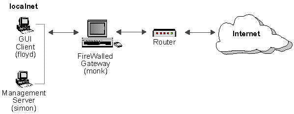 В конфигурации, представленной на рисунке 13, функционально Модуль Управления разделен на две рабочие станции (simon and floyd). Модуль Управления, включая сервер FireWall-1, расположен на компьютере simon. Клиентская часть расположена на компьютере floyd.