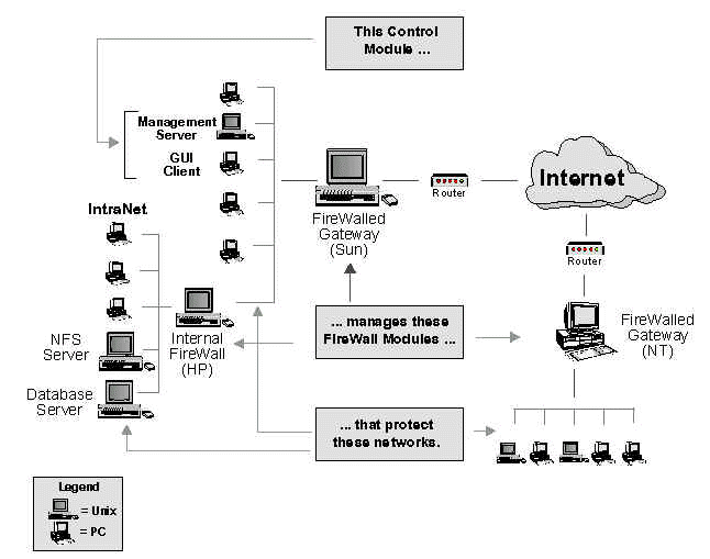 Начиная с версии FireWall-1 Version 2.1, управляющий модуль также выполнен по технологии клиент-сервер. Графический интерфейс на клиенте может работать под управлением Windows 95 или Windows NT и управлять сервером на одной из поддерживаемых платформ Windows NT, SunOS 4.1.3, Solaris 2.x, HP-UX 9 и 10.