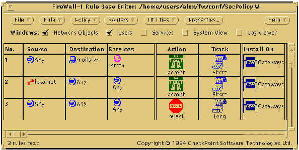 CheckPoint FireWallЦ1 включает мощный и интуитивный графический интерфейс пользователя и интерфейс командной строки. Консоль Управления CheckPoint FireWallЦ1 работает в системе Windows, Solaris, OpenWindows и OPEN LOOKо X11R5. Все возможности CheckPoint FireWallЦ1 доступны из командной строки, что позволяет работать с ним со стандартного компьютерного терминала.