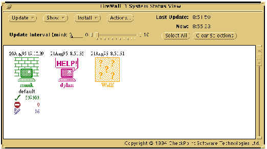 Окно Состояния Системы отображает текущее состояние всех Модулей FireWall и маршрутизаторов Wellfleet в любое заданное время. Генерируемые отчеты включают состояние Модуля FireWall, статистику по пакетам (пропущено, блокировано, зарегистрировано, и т.д.).