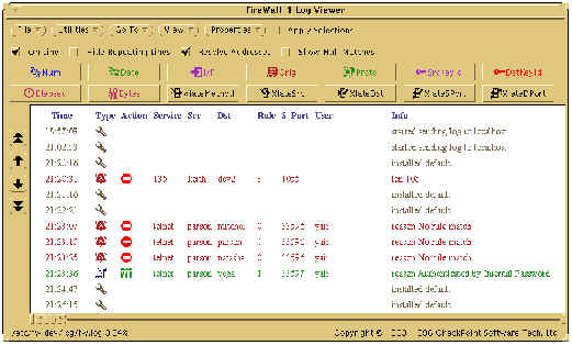 В Базе Правил администратор может определять правила регистрации и оповещения администратора для любой попытки связи, независимо от того пропускается ли пакет или нет. Форматы данных для регистрации и предупреждения, а также действия, связанные с ними, открыты и могут быть настроены пользователем. Стандартные форматы содержат информацию об источнике и адресате, сервисе, используемом протоколе, времени и дате, исходном порте, предпринимаемом действии (установлено соединение, пропущено, блокировано), файле регистрации и типе предупреждения, номере правила, пользователе, а также Модуле FireWall, который инициировал зарегистрированное событие. Любая информация о попытке связи может регистрироваться или использоваться для вызова сообщения (например, высветить окно с предупреждением, послать почтовое сообщение).
