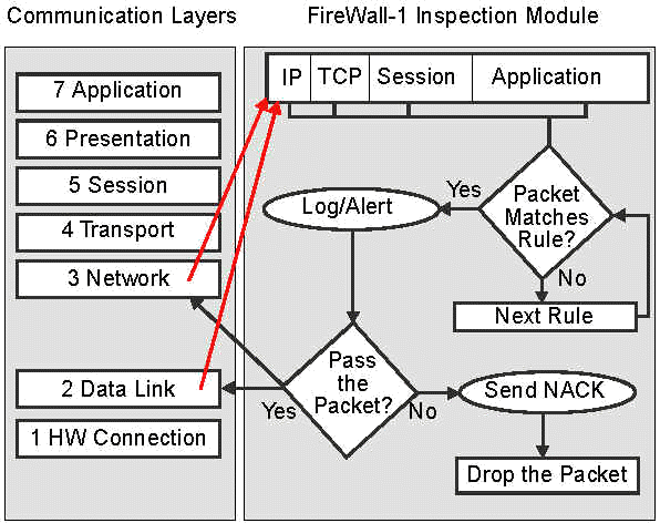 Работая на этом уровне, CheckPoint FireWallЦ1 гарантирует, что Инспекционный Модуль контролирует и проверяет весь входной и выходной трафик на всех интерфейсах. Ни один из входящих пакетов не будет обработан стеками протоколов более высоких уровней, независимо от того какой протокол или приложение использует этот пакет, до тех пор, пока Инспекционный Модуль не проверит пакет на соответствие стратегии защиты.