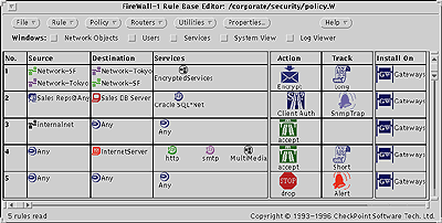 Base Editor. FireWall-1's award-winning graphical user interface makes it easy to build an enterprise-wide security policy. Object-oriented technology simplifies the definition process and the editor checks automatically for rule base consistency. |