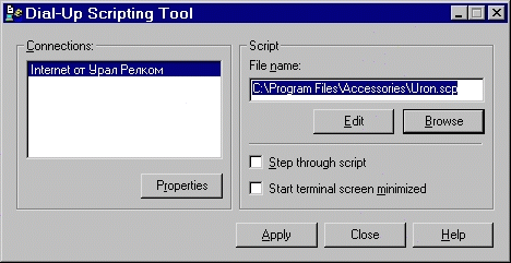 Для того, чтобы каждый раз не приходилось вводить свои "Имя пользователя" и "Пароль" существует специальный язык сценариев входа в сеть, который устанавливается программой SCRIPT.EXE и затем настраивается в меню "Пуск->Программы->Accessories->Dial-Up Scripting Tool".