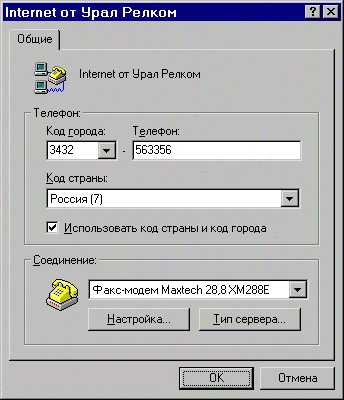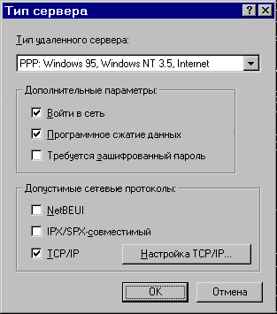 Затем в окне "Internet от Урал Релком" нажимаете кнопку "Тип сервера". Окно "Тип сервера" приведите к следующему виду: