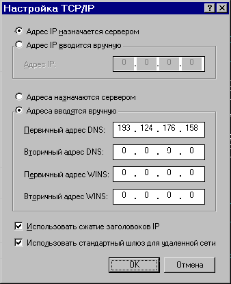 иначе, выбираете "Адрес IP вводится вручную" и вводите Ваш адрес. После чего закрываете окна "Настройка TCP/IP" и "Тип сервера" нажимая на клавиши "OK".