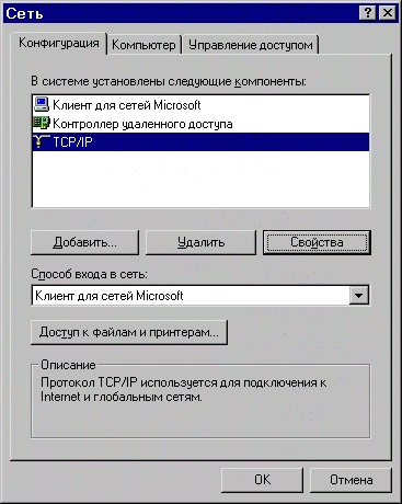 Для того, чтобы проверить и/или настроить сетевое окружение для удаленного доступа к сети выберите "Пуск->Настройка->Панель управления->Сеть". Если Вы не подключаетесь к локальной сети с помощью сетевой платы и сетевая плата не установлена в компьютере, то экран настроек сетевого окружения должен иметь вид: