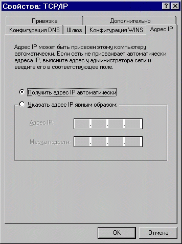 Если Вам не присвоен определенный адрес IP, то Вы оставляете переключатель в позиции "Получить адрес IP автоматически" и переключаетесь на закладку "Конфигурация WINS".