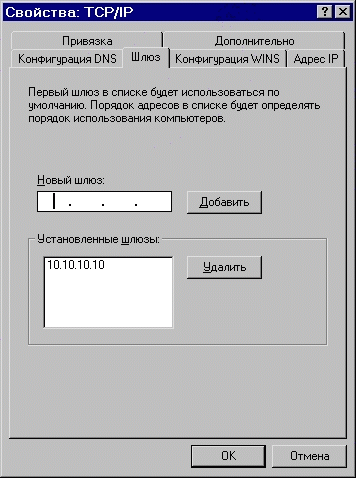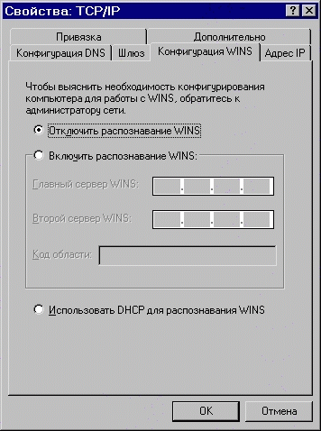 Этот экран настраивается однозначно - переключатель ставится в позицию "Отключить распознавание WINS". Следующая закладка - "Шлюз".