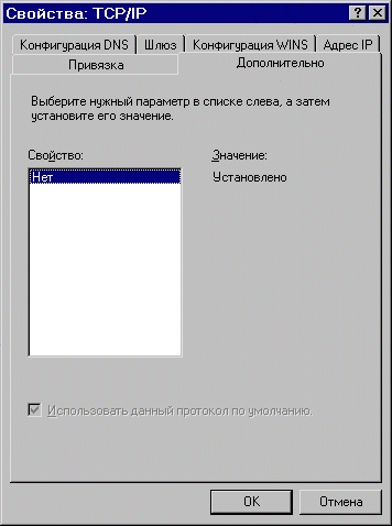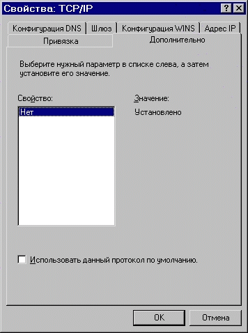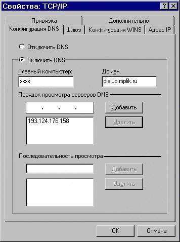 Настройки в этом экране следует проверять имея под рукой бланк регистрации. Если переключатель стоит в позиции "Отключить DNS", то Вам нужно переключить в позицию "Включить DNS ". Строка "Главный компьютер" должна совпадать со строкой "Главный компьютер (host)", строка "Домен" с "Имя Вашего домена (domain)", а в списке "Порядок просмотра серверов DNS" должно быть записано значение <193.124.176.158>. В том случае, если список пустой, то вводите IP адрес сервера DNS и нажимаете клавишу "Добавить". Настройку можно считать законченой, если Вы не подключаетесь к локальной сети с помощью сетевого адаптера. Если Вы подключаетесь к локальной сети, то Вам нужно проверить закладку "Дополнительно", где опция "Использовать данный протокол по умолчанию" должна быть выключена.